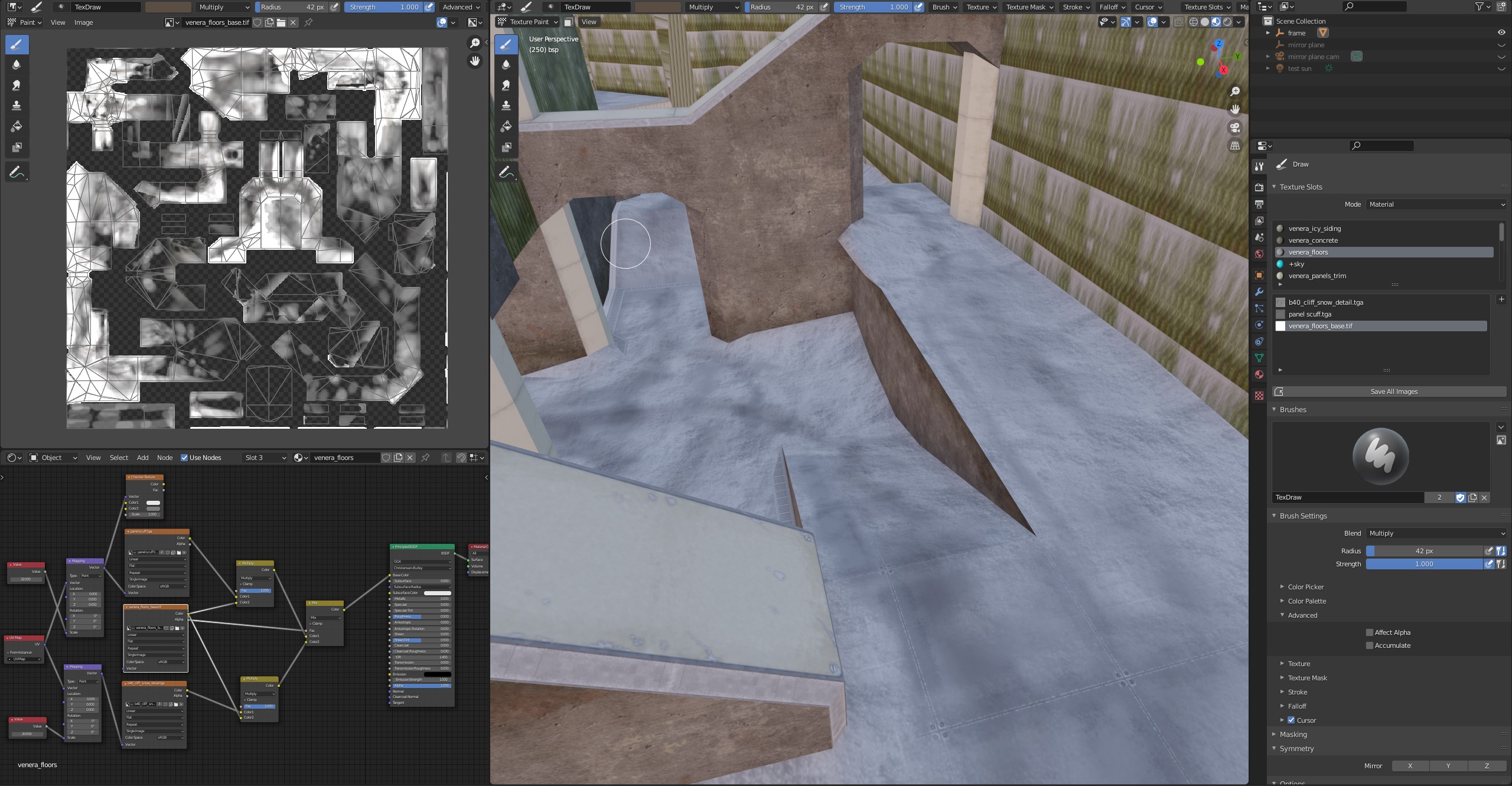 I also used this tool to paint basic foot paths into the RGB channels and ensure that paths were continuous as they passed from one UV island to the next. Later, I brought the base map into Krita for its more powerful brushes and further detailed the texture. A similar process was used on the green exterior metal siding of the power plant; it's a large blend map where I've painted ice on upper edges of the panels and windward sides.